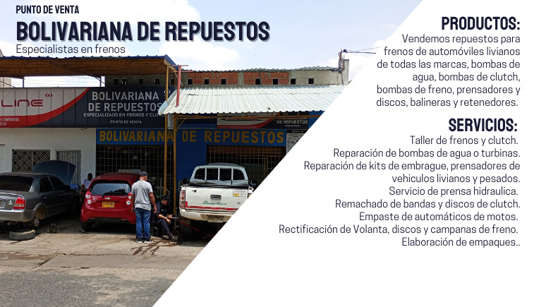 Vendemos repuestos para frenos de automóviles livianos de todas las marcas, bombas de agua, bombas de clutch, bombas de freno, prensadores y discos, balineras y retenedores. Realizamos mantenimiento de frenos y clutch, servicio de prensa, remachado de bandas y discos de clutch, empaste de automáticos de motos, rectificación de Volanta, discos y campanas; reparación de kits de embrague de vehiculos livianos y pesados, y elaboración de todo tipo de empaques.